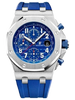 Audemars Piguet Royal Oak Offshore Selfwinding Chronograph Watch 42 mm stainless steel case, 14.6 mm thick, sapphire crystal back, blue ceramic pushpieces and screw-locked crown, blue dial with Méga Tapisserie pattern, blue counters, Arabic numerals with luminescent coating, white gold Royal Oak hands with luminescent coating, Calibre 3126 / 3840 Manufacture movement with chronograph, hours, minutes, small seconds, date, approximately 50 hours of power reserve, blue rubber strap, stainless steel pin buckle. Water resistant to 100 m.