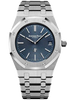39mm x 49mm x 8.10mm stainless steel case, sapphire crystal back, screw-locked crown, glareproofed sapphire crystal, blue dial with petite tapisserie pattern, gold applied hour-markers, and Royal Oak hands with luminescent coating, self-winding Audemars Piguet Calibre 2121 movement with date, approximately 40 hours of power reserve, stainless steel bracelet. Water resistant to 50 meters