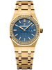 33mm 18k yellow gold case, 7mm thick, bezel set with 40 brilliant-cut diamonds (~0.73 carats), glareproofed sapphire crystal, blue dial with “Grande Tapisserie” pattern, yellow gold applied hour-markers and Royal Oak hands with luminescent coating, Calibre 2713 quartz movement with hours, minutes, date, 18K yellow gold bracelet, AP folding buckle. Water resistant to 50 meters