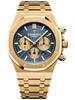 41 mm 18K yellow gold case, 11 mm thick, screw-locked crown, blue dial with Grande Tapisserie pattern, yellow gold-toned counters, yellow gold applied hour-markers and Royal Oak hands with luminescent coating, Calibre 2385 selfwinding movement with chronograph, hours, minutes, small seconds and date, approximately 40 hours of power reserve, 18K yellow gold bracelet, AP folding buckle , comes with additional blue alligator strap. Water resistant to 50 m.