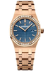 33 mm 18K pink gold case, 7 mm thick, diamond-set bezel, blue dial with Grande Tapisserie pattern, pink gold applied hour-markers and Royal Oak hands with luminescent coating, Calibre 2713 movement with hours, minutes, date, 18K pink gold bracelet, AP folding buckle. Water resistant to 50 m.