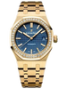 37 mm 18K yellow gold case, 9.8 mm thick, sapphire crystal back, screw-locked crown, diamond-set bezel, blue dial with Grande Tapisserie pattern, yellow gold applied hour-markers and Royal Oak hands with luminescent coating, Manufacture Calibre 3120 selfwinding movement with hours, minutes, centre seconds and date, approximately 60 hours of power reserve, 18K yellow gold bracelet, AP folding buckle. Water resistant to 50 m.