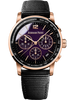 The chronograph’s 18-carat pink gold case is adorned with a sunburst smoked purple lacquered dial and a matching rubber-coated strap.