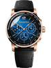 The chronograph’s 18-carat pink gold case is adorned with a sunburst smoked blue lacquered dial.