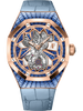 | BAND MATERIAL | Hand-stitched “large square-scale” light blue alligator strap with 18-carat pink gold AP folding clasp set with baguette-cut blue sapphires. Additional light blue rubber strap with “constellation” decoration |