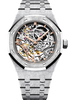 Openworked rhodium-toned dial, pink gold applied hour-markers and Royal Oak hands with luminescent coating. |