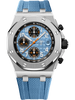 Blue rubber strap with textile decoration with stainless steel AP pin buckle and interchangeable strap system. Additional black calfskin strap. |