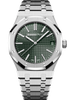 Khaki green dial with “Grande Tapisserie” pattern, white gold applied hour-markers and Royal Oak hands with luminescent coating. |