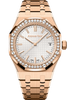 This 37 mm model benefits from the Royal Oak design evolution and the selfwinding Calibre 5900, both introduced in 2022. Its 18-carat pink gold case and bracelet are contrasted with a silver-toned “Grande Tapisserie” dial and a diamond-set bezel.