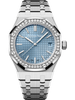 This 37 mm stainless steel timepiece encompasses the latest Royal Oak design evolution and the selfwinding Calibre 5900. The brilliant-cut diamonds decorating the bezel elegantly frame the light blue “Grande Tapisserie” dial.