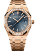 The 34 mm selfwinding timepiece enhances 18-carat pink gold with a diamond-set bezel and a "Bleu Nuit, Nuage 50" "Grande Tapisserie" dial. The watch also incorporates the latest Royal Oak design evolution.