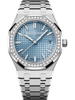 This 34 mm stainless steel selfwinding timepiece is enriched with a diamond-set bezel and a light blue "Grande Tapisserie" dial. It also incorporates the latest Royal Oak design evolution.