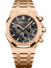 Black dial with “Grande Tapisserie” pattern, black counters, pink gold applied hour-markers and Royal Oak hands with luminescent coating. |