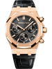 The 18-carat pink gold 41 mm case is enhanced by a black “Grande Tapisserie” dial and a matching alligator strap. This Selfwinding Chronograph also encompasses the latest Royal Oak design evolution.