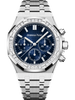 Smoked blue dial with “Grande Tapisserie” pattern, blue counters and external zone, baguette-cut diamond hour-markers, white gold Royal Oak hands with luminescent coating. |