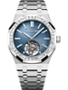Smoked blue dial with “Grande Tapisserie” pattern, baguette-cut diamond applied hour-markers and Royal Oak hands with luminescent coating.