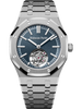 This Selfwinding Flying Tourbillon in 41 mm, which benefits from the latest Royal Oak design evolution, combines a titanium case and bracelet with a sandblasted smoked blue dial.