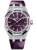 Brilliant-cut sapphires in graded hues of pink and blue adorn the white gold bezel and illuminate the purple dial. The case is further gem-set with brilliant-cut diamonds. 18-carat white gold case, glareproofed sapphire crystal and caseback, bezel set with blue to pink brilliant-cut graded sapphires, screw-locked crown. Purple dial with “Grande Tapisserie” pattern, white gold applied hour-markers with 2 diamond-set hour-markers at 12 o’clock, and Royal Oak hands with luminescent coating.