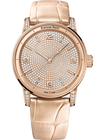 18-carat pink gold dial set with brilliant-cut diamonds, pink gold applied hour-markers and hands, pink gold-toned inner bezel.
