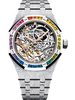 The shimmering 18-carat Frosted Gold case and bracelet are enhanced by a bezel set with 32 baguette-cut rainbow-coloured sapphires (2.24 carats), all individually cut. Hammered 18-carat white gold case, bezel set...