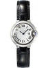 28.5 mm by 9.35 mm thick stainless steel case, fluted crown set with a blue synthetic spinel cabochon, sapphire crystal, silver dial with Roman numerals and blued steel hands, caliber 057 quartz movement, black alligator strap. Water resistant to 30 meters.
