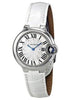 33 mm by 9.96 mm thick stainless steel case, stainless steel fluted crown set with a blue synthetic spinel cabochon, sapphire crystal, silver dial with Roman numerals and blued steel hands, caliber 057 quartz movement, white alligator strap. Water resistant to 30 meters.