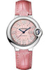 33mm steel case, 9.96mm thick, sapphire back, fluted crown set with a synthetic spinel cabochon, steel bezel, sapphire crystal, pink dial with sunray finish and lacquer, caliber 076 automatic movement with blued steel sword-shaped hands, fuchsia-pink alligator skin strap. Water resistant to 30 metres.