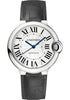 36.6 mm by 12 mm thick stainless steel case, stainless steel fluted crown set with a blue synthetic spinel cabochon, sapphire crystal, silver dial with Roman numerals and blued steel hands, caliber Cartier 076 automatic movement, black alligator strap. Water resistant to 30 meters.