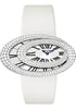 18K white gold case set with diamonds, white dial, quartz movement, white strap.