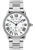 42 mm by 8.36 mm thick stainless steel case, beaded crown set with a synthetic spinel cabochon, sapphire crystal, silver dial with 12 Roman numerals and blued steel hands, caliber Cartier 049 automatic movement, stainless steel bracelet. Water resistant to 30 meters.