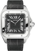 Cartier Santos Triple 100 Limited Edition Watch Extra large size (45.6mm x 57.9mm) palladium case, transparent back, mechanical rotating shutter dial with option to change between 18K gold dial engraved with black Roman numerals, skeleton dial, and black varnished dial with white Roman numerals, manual winding Cartier calibre 9611 MC movement with skeleton bridges shaped like Roman numerals, alligator strap with 18K gold and palladium triple adjustable deployant buckle. Water resistant to 30 meters.