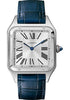 43.5 mm x 31.4 mm stainless steel case, 7.3 mm thick, beaded crown set with a blue synthetic cabochon-shaped spinel, sapphire crystal, satin-brushed silver dial with sunray effect, quartz movement, navy blue strap, steel ardillon buckle. Water resistant to 3 bar (approx. 30 meters/100 feet).