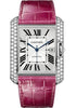 47mm x 36.2mm 18K white gold case set with diamonds, 9.82mm thick, nine sided crown with a cut diamond, sapphire crystal, silvered dial with blued steel hands, caliber 1904 MC automatic movement, fuschia alligator strap, double adjustable deployant buckle in 18K white gold. Water resistant to 30 meters.