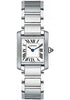 Small size, stainless steel case, silver dial, quartz movement, stainless steel bracelet. Water resistant to 30 meters (100 feet).
