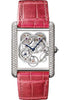 30mm 18K white gold case set with 254 brilliant-cut diamonds, 7.45mm thick, sapphire back, beaded crown set with a brilliant-cut diamond (0.12 carats), sword-shaped hands in blued steel, 18K white gold bezel set with 43 diamonds, sapphire crystal, silver dial, caliber 9616 MC manual-winding movement, approximately 3 days of power reserve, fuchsia alligator skin strap, folding buckle. Water resistant to 3 bar.