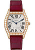 39mm x 31mm 18K pink gold case brilliant-cut diamonds, 8.6mm thick, steel back, octagonal crown set with a brilliant-cut diamond, 18K pink gold bezel set with a brilliant-cut diamonds, silver dial with sunray effect flinqué, manual-winding movement with sword-shaped hands in blued steel, mineral glass, bordeaux alligator skin strap, folding buckle. Water resistant to 30 meters.