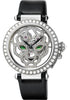 Cartier Pasha Skeleton Watch 42mm 18K white gold case set with round diamonds, 9.4mm thick, sapphire back, diamond set crown, sapphire crystal, 18K white gold dial with a panther-head motif created by the bridges of the movement, bridges in 18K white gold set with round diamonds, 2 tsavorite garnet eyes, onyx nose and diamond-shaped black oxidized-steel hands, caliber 9613 MC manual movement, black fabric strap, deployant buckle with 18K white gold set with diamonds. Water resistant to 30 meters.