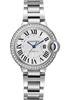33mm steel case, 10mm thick, fluted crown with a synthetic cabochon-shaped spinel, steel bezel with 50 brilliant-cut diamonds totalling 0.63 carats, mineral crystal, silvered dial with sunray effect, automatic movement, steel bracelet with wrist size 175mm. Water resistant to 30 meters.