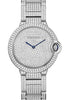 Medium size (36.6mm) rhodiumized 18K white gold case set with brilliant-cut diamonds, fluted crown set with a blue sapphire cabochon, sapphire crystal, brilliant-cut diamond paved dial with sword-shaped blued-steel hands, self-winding caliber Cartier 076 movement, rhodiumized 18K white gold bracelet set with brilliant-cut diamonds. Water resistant to 30 meters.