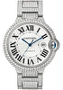 Large size (42.1mm) 18K white gold case set with diamonds, guilloché and lacquered dial with Roman numerals and date at 3 o'clock, automatic winding Cartier calibre 049 movement, 18K white gold bracelet set with diamonds. Water resistant to 30 meters.