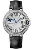 Cartier Ballon Bleu de Cartier Moonphase Watch 37mm 18K white gold case, diamond paved bezel, sapphire crystal, silver dial with blued-steel sword-shaped hands, self-winding movement with hours, minutes, and moonphase, black alligatgor strap. Water resistant to 30 meters.