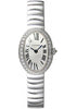 Mini size (25.30mm x 20.795mm) rhodiumized 18K white gold case set with round diamonds, twelve-sided crown set with a diamond, sapphire crystal, silvered sunray finish dial with Roman numerals and sword-shaped blued-steel hands, quartz caliber 059 movement, rhodiumized 18K white gold bracelet. Water resistant to 30 meters.