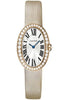 Small (31.6mm x 24.5mm) 18K pink gold case set with round diamonds, silvered dial with sun-like finish, quartz Cartier calibre 057 movement, fabric strap with 18K gold ardillon buckle. Water resistant to 30 meters.