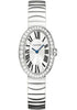 Small (31.6mm x 24.5mm) 18K white gold case set with round diamonds, silvered dial with sun-like finish, quartz Cartier calibre 057 movement, 18K gold bracelet. Water resistant to 30 meters.