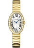 Small (31.6mm x 24.5mm) 18K yellow gold case set with round diamonds, silvered dial with sun-like finish, quartz Cartier calibre 057 movement, 18K gold bracelet. Water resistant to 30 meters.
