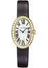 Small (31.6mm x 24.5mm) 18K yellow gold case set with round diamonds, silvered dial with sun-like finish, quartz Cartier calibre 057 movement, fabric strap with 18K gold ardillon buckle. Water resistant to 30 meters.