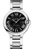 42 mm stainless steel case, 13 mm thick, fluted crown decorated with a synthetic cabochon-shaped spinel, sapphire crystal, black dial with Roman numeral and sword-shaped hands in blue steel, self-winding movement, stainless steel bracelet. Water resistant to 30 meters.