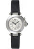 27mm stainless steel case cover with a blue synthetic spinel cabochon, silvered opaline dial with Arabic numerals, quartz Cartier caliber 157 movement, toile de moire strap with adjustable deployant buckle. Water resistant to 30 meters.
