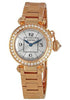 27mm 18K white gold case set with round diamonds with protector set with a diamond, silvered dial with sunray finish and Roman numerals, quartz Cartier caliber 157 movement, 18K white gold bracelet. Water resistant to 30 meters.