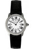Small size, stainless steel case, silver dial, quartz movement, alligator strap with stainless steel deployant buckle. Water resistant to 30 meters (100 feet).